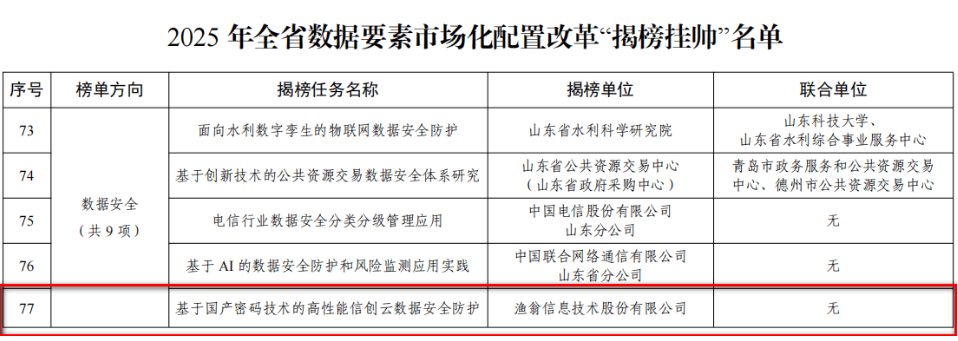 近期,山东省大数据局公布了《2025年全省数据要素市场化配置改革“揭榜挂帅”名单》。奥林匹斯之门 pp电子奥林匹斯之门信息独立申报的“基于国产密码技术的高性能信创云数据安全防护”项目,凭借在数据安全与要素流通领域的技术创新与实践成果,从众多单位中脱颖而出,成功入选。奥林匹斯之门 pp电子奥林匹斯之门信息成为揭榜单位中唯一的商密企业